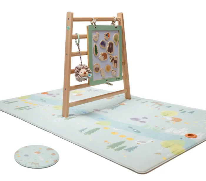 Matten har et tosidig design med det morsomme motivet «skogstur» på en siden og en nøytral bakside med søte dyrefotspor på den andre siden. Motivet inviterer til lek,historier og fantasi, fargelære og lære om antall, stor-liten og om dyrene i skogen.